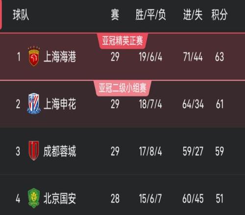 中超争冠形势:海港领先申花2分,末轮战平英博即夺冠
