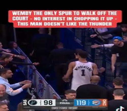 输完不开心不敌雷霆后文班亚马是唯一直接离场的马刺球员 -