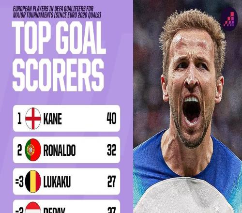 近4届欧预赛+世预赛射手榜:凯恩40球第1,C罗32球第2 -